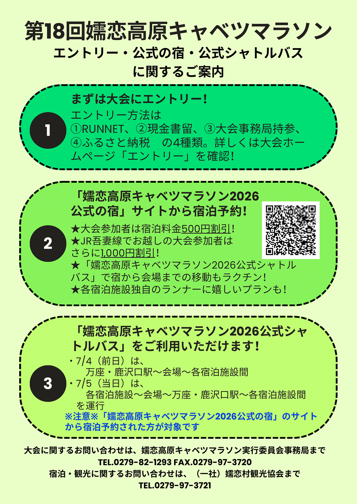 第18回嬬恋高原キャベツマラソンのエントリー開始に先立ち、エントリー・宿泊予約・公式シャトルバスに関するご案内です。